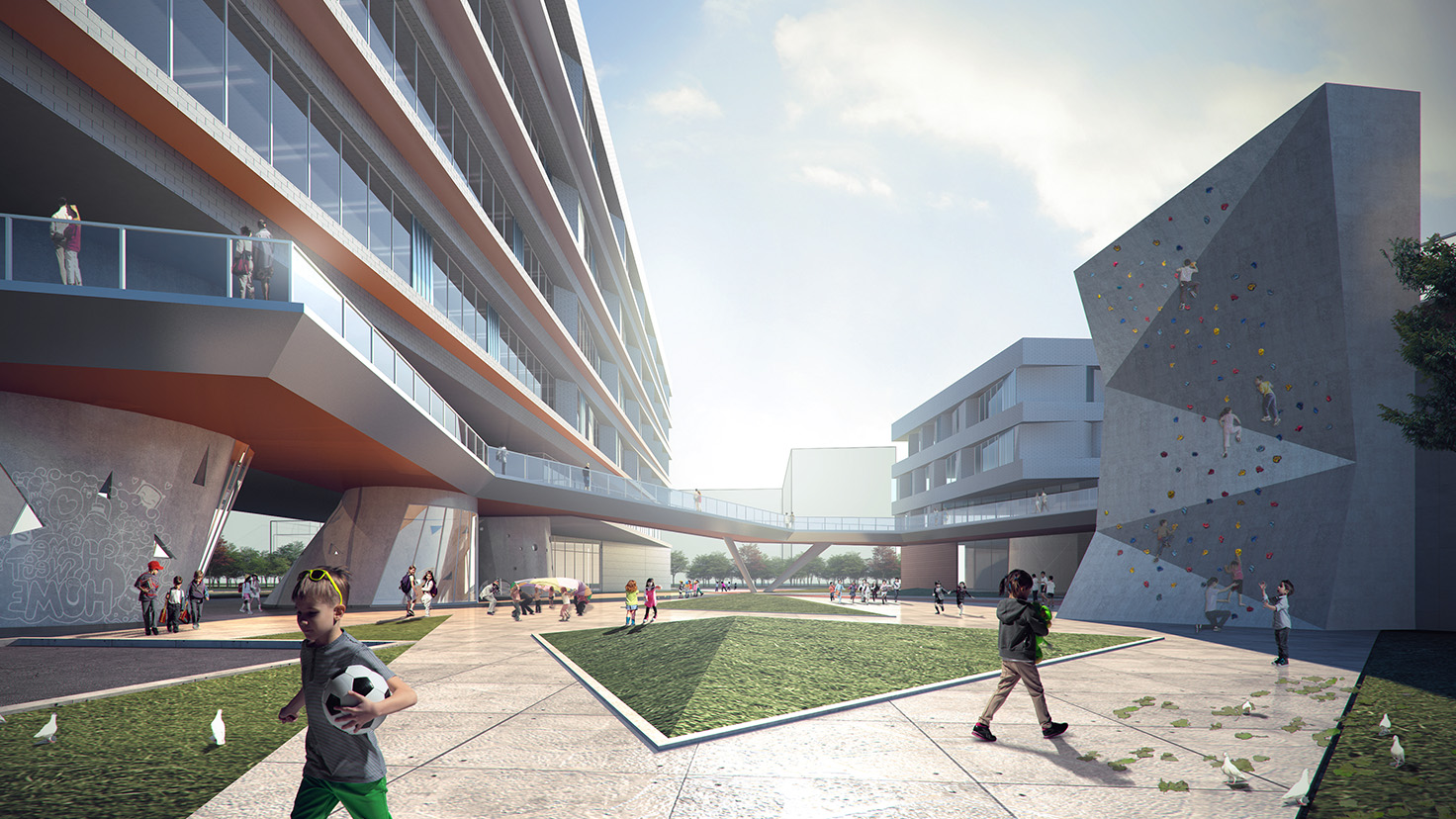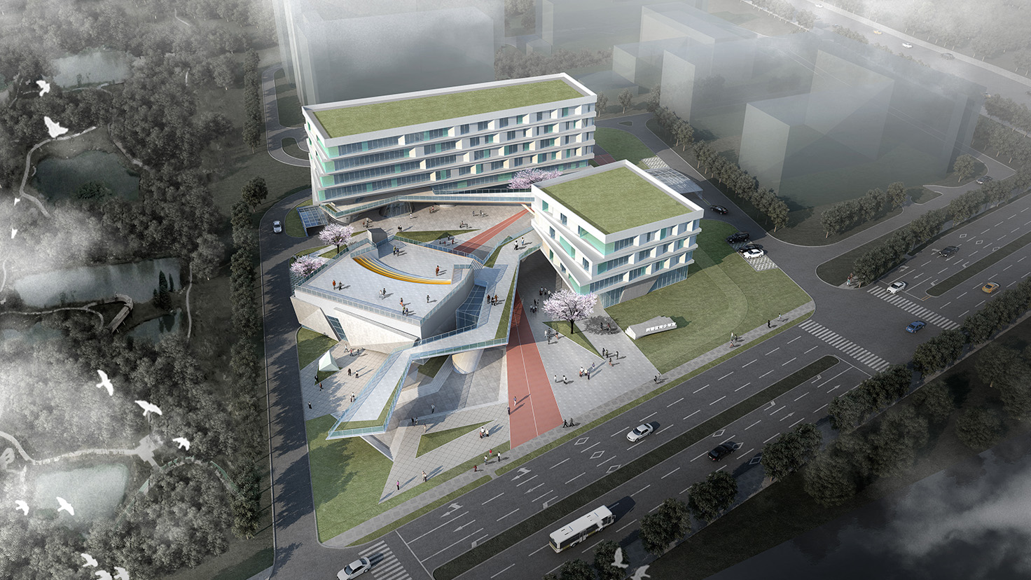 設(shè)計(jì)背景:提出城市公園的概念,在場地的西南側(cè)、靠近瀏陽河風(fēng)光帶以及濕地公園,利用架空平臺(tái)可以更好地欣賞到沿河以及公園景觀,引入一條連接濱河路與濕地公園的帶狀活動(dòng)空間,打破原本封閉的體量。 采用分散式布局,利用多層次的室外平臺(tái)將各個(gè)功能分區(qū)聯(lián)系起來,營造立體公園式的公共交流空間;橢圓形的運(yùn)動(dòng)場館臨濱河路布置,具有較好的標(biāo)志性和引導(dǎo)性;入口前廣場與旁邊福利中心的廣場結(jié)合,促進(jìn)更豐富的城市文化活動(dòng)的展開。